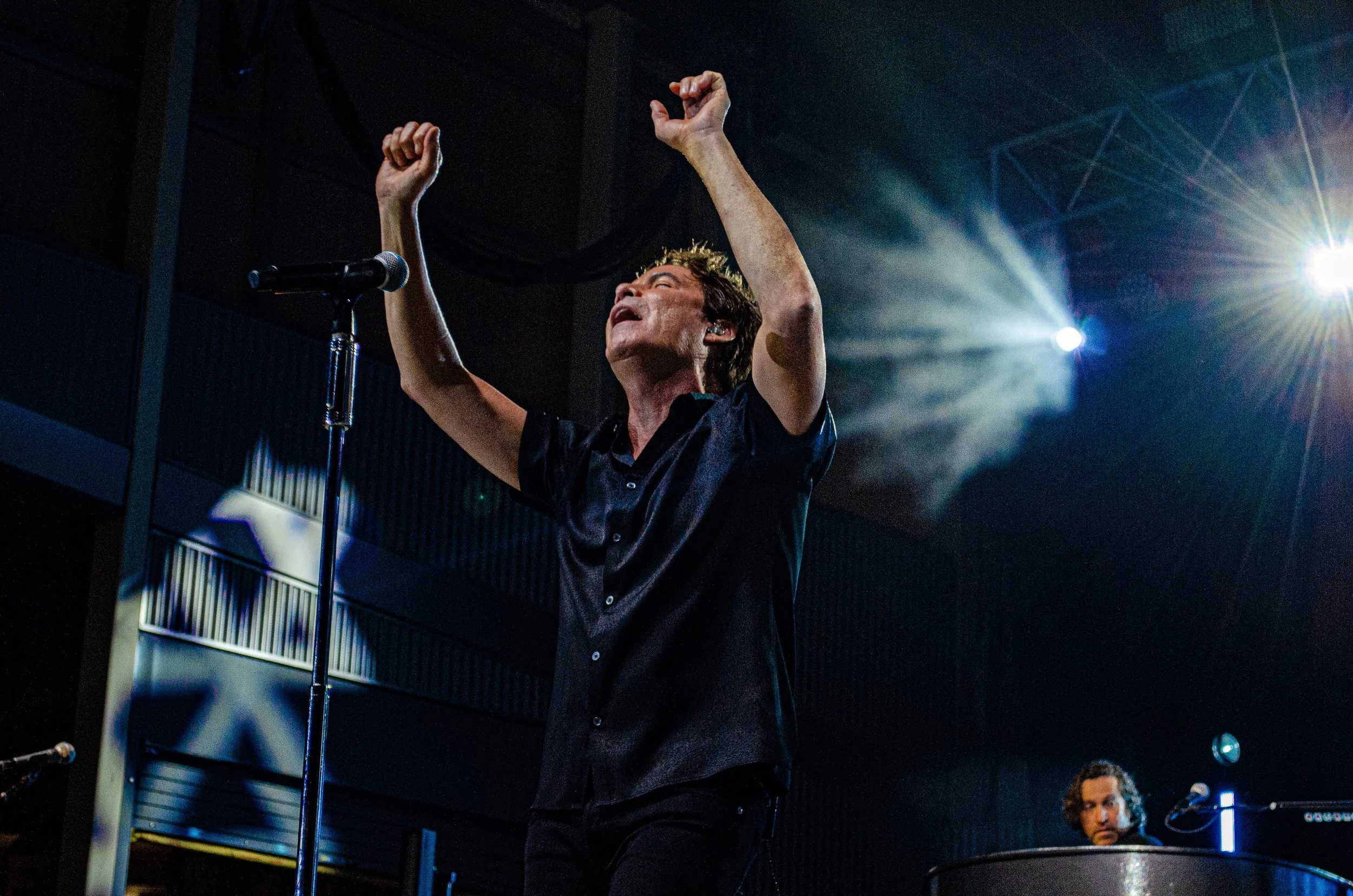 The amphitheater, combined with the atmosphere of summer weather and energetic fans, was a perfect contender for Train to perform a summer show. The show began with a familiar face, that being the opening act Edwin McCain. Edwin gave a solid acoustic performance, telling stories about his kids and playing 90s hits such as I’ll Be. As the sun went down, Train walked onto the stage and began. Pat was immediately drawn to the crowd, showing love and gratitude towards the fans surrounding him. It was obvious that songs like Meet Virginia would be ecstatic in this state, and that was proven to be true quickly, as the crowd sang every word.